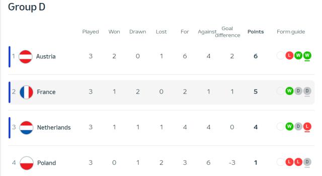 第75分钟,韦霍斯特头球做球,德佩外脚背撩射得手,荷兰再度扳平。荷兰升至第二,奥地利回到第三。