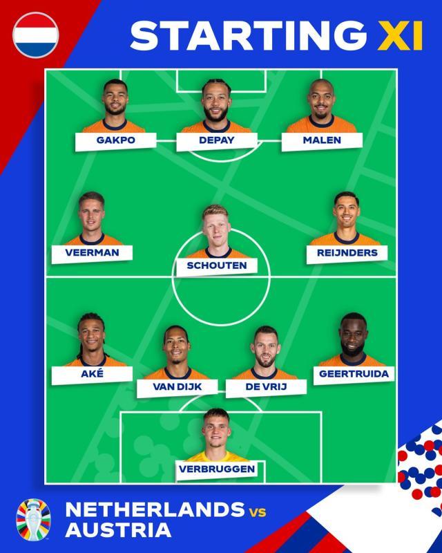 荷兰队首发:费布吕亨/海特勒伊达,德弗赖,范戴克,阿克(65'范德芬)/赖恩德斯(65'维纳尔杜姆),斯豪滕,乔伊·费尔曼(35'哈维·西蒙斯)/马伦(72'韦霍斯特),孟菲斯·德佩,哈克波
