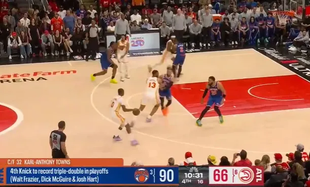 根据数据统计,唐斯是尼克斯队史第4位季后赛砍下三双的球员,上一位是哈特。此前还有沃尔特-弗雷泽、迪克-麦克奎尔。