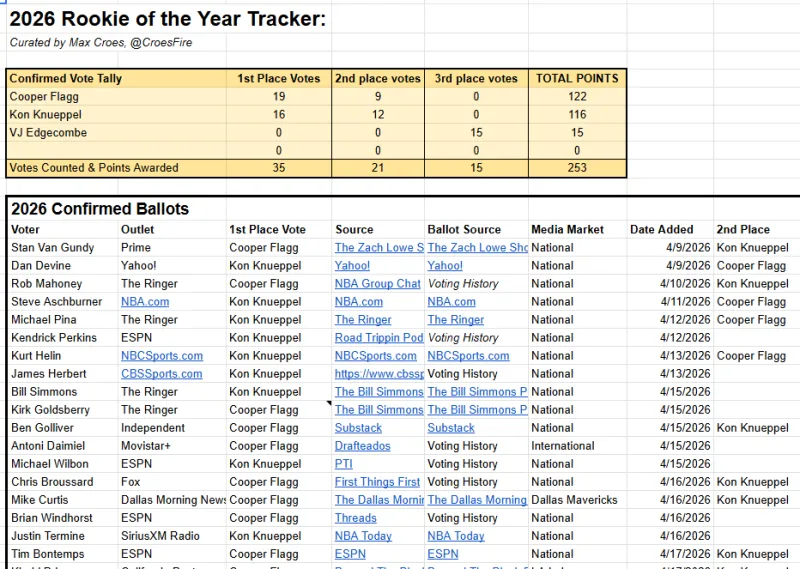 据统计,目前有35名投票人公布了他们本赛季常规赛最佳新秀球员的选票。